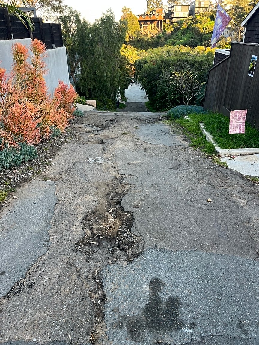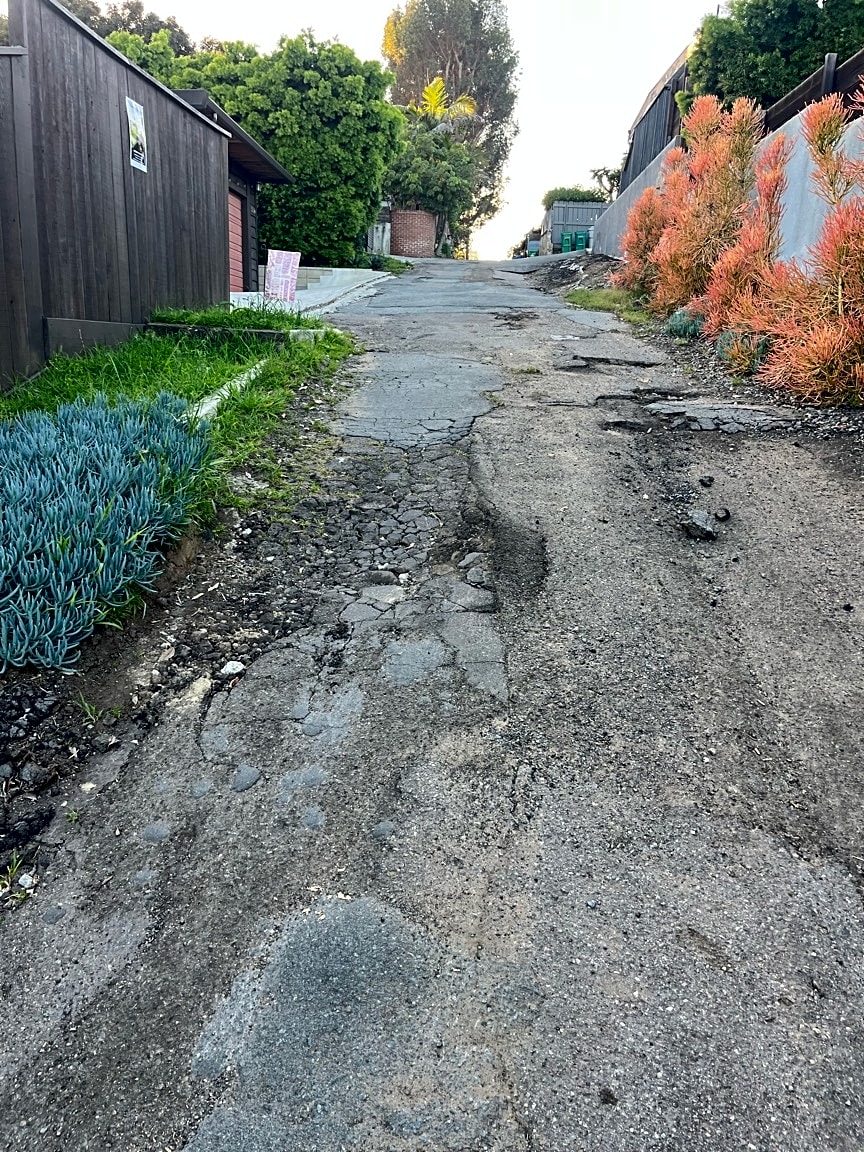3518–3560 Inez LnDangerous street conditions for pedestrians, city trash/recycling trucks and cars due to lack of real paving. Small patches have been paved and with rains the materials crumbles and debris is rolling down or coming apart. Numerous cars and pedestrians use this street and weekly city trucks add to further damage of the street. Multiple trucks should be required to come help repave the street. The extremely loose concrete is a hazard and potential lawsuit for the city, pedestrians could slip fall || LOCATION: In front of 3530 Inez Lane and 3522 Inez Lane between Albion street and Gage Lane || LANE: Both || DIRECTION: Northbound