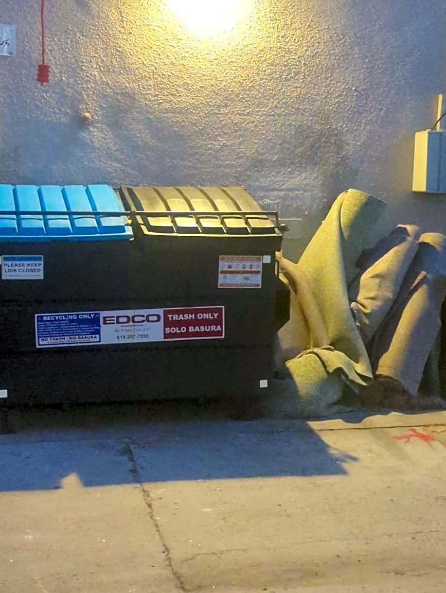 7501–7539 Camino de la RosaEncampment/Homeless; 1 or more occupants. LED strip lights at night & noise coming from encampment. In location well over 7+ days. South side of street & was there previously on opposite side of street (North).